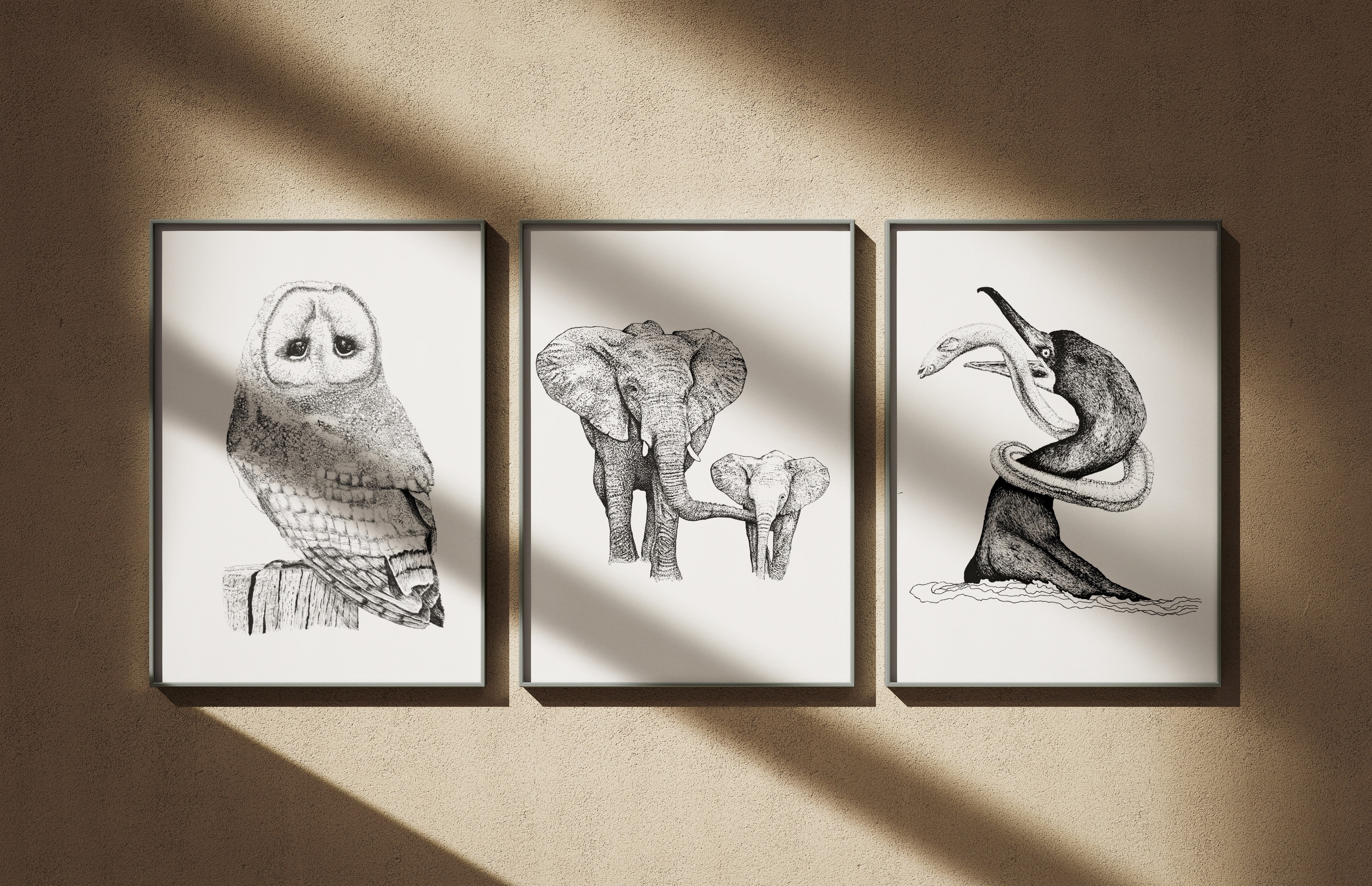 With a background in the sciences, and a lifetime observing nature and the world around her, Naomi has a good understanding of natural processes and the creatures that inhabit it. When she draws a creature she bases her images on personal experiences. She visualises how the creature moves beneath their skin, fur and scales, bringing a realism, alongside drama and humour, to her work. She finds this resonates with viewers, and may explain why one of her pieces was stolen from a professional gallery last summer.
